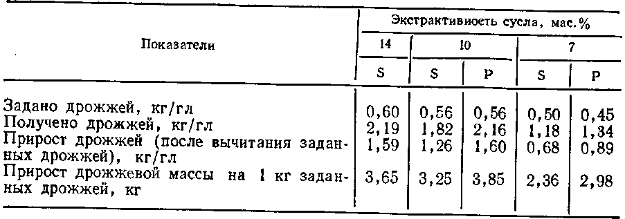 Прирост дрожжей и дрожжевой массы дрожжей типов S и P в сусле с разной экстр активностью приведен в табл. 21.