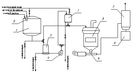1 – чан для дрожжевой суспензии; 2 – сетчатый цедильник; 3 – сепаратор; 4 – бак–накопитель; 5 –сушилка; 6 – пневмотранспорт;7 – циклон; 8 – сборник–накопитель продукта;