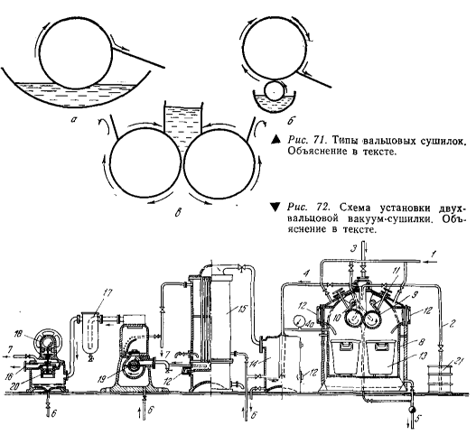 Одновальцовая сушилка с непогруженным вальцом (.рис. 71, б). Между вальцом и жидкостью имеется питающий валик, при помощи которого может регулироваться слой жидкости. Исключен перегрев. Эта сушилка рациональнее, чем предыдущая.