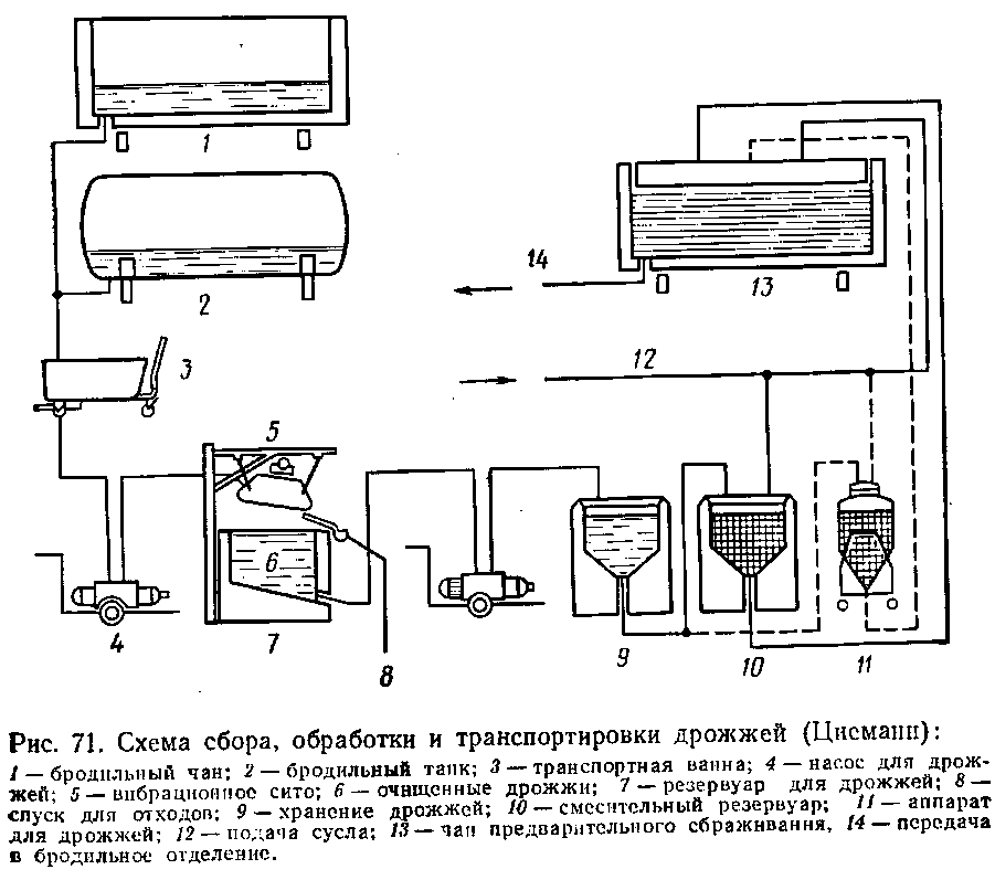 Как правило, снятые дрожжи при хорошей организации производства транспортируют в специально предназначенное для этого помещение, которое должно находиться в бродильном отделении или поблизости, охлаждаться до температуры 4°С и хорошо проветриваться. Такое помещение обычно до потолка выложено плиткой, имеет асфальтовый пол без щелей и с достаточным уклоном к сборникам для отходов. В помещении находятся только ванны или резервуары другого типа для дрожжей; необходимые инструменты хранятся в другом помещении. Иногда здесь же находится алюминиевый танк с холодной водой для промывки дрожжей, который постоянно пополняется. Вместо деревянных ванн применяют опрокидывающиеся эмалированные, алюминиевые или из нержавеющей стали. Раньше эти ванны имели сдвоенное дно для охлаждения. Однако, если работают с охлажденной водой и температура помещения не выше 4°С, то дрожжи в ваннах уже не следует охлаждать.