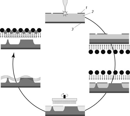 На мал. 2 показана послідовність операцій виготовлення флексографської форми на пластині, що містить масочний шар 1, шар фотополімеру 2 і підкладку 3. Після видалення лазером масочного шару в місцях, що відповідають друкуючим елементам, експонується прозора підкладка з метою створення основи фотополімерної форми. Експонування для одержання рельєфного зображення здійснюється через негативне зображення, створене з масочного шару. Потім проводиться звичайна обробка, що складається з вимивання незаполімеризованого фотополімеру, промивання й доекспонування з одночасною сушкою.