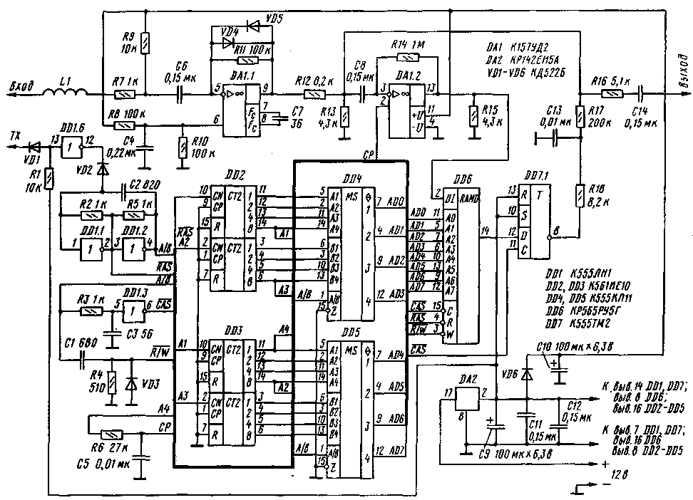 Особенность устройства - отсутствие АЦП и ЦАП. На пути к упрощению конструкции пришлось применить широтно-импульсную модуляцию (ШИМ), отказавшись от импульсно-кодовой и дельта - модуляции. Это привело к необходимости значительно увеличить объем памяти, однако применение всего одной микросхемы КР565РУ5 дает возможность получить задержку 100... 200 мс, что в большинстве случаев достаточно.