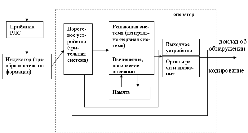 Оператор здесь включён в систему «как бы параллельной» (хотя на схеме рисунка это выглядит последовательно). Основная функция оператора – контроль, наблюдение за системой, измерение её параметров и т. п. Примером такой системы может являться работа оператора с индикатором кругового обзора ИКО.