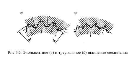 Шлицевые соединения различают: по характеру соединения - неподвижные для закрепления детали на валу (рис. 5.1); подвижные, допускающие перемещение вдоль вала (например, блока шестерен коробки передач; по форме зубьев прямобочные (рис. 5.1), эвольвентные (рис. 5.2, а), треугольные (рис. 5.2, 6), по способу центрирования (обеспечения совпадения геометрических осей) ступицы относительно вала с центрированием по наружному диаметру В (см. рис. 5.1, а), по внутреннему диаметру й (см. рис. 5.1, 6) и по боковым поверхностям зубьев (рис. 5.1, в и 5.2). Зазор в контакте поверхностей: центрирующих практически отсутствует, нецентрирующих значительный.