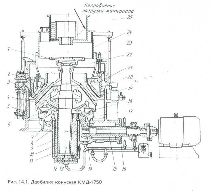 Неподвижный конус предохраняется от износа броней 19, закрепляемой на конусе скобами 22. В верхней части дробилка закрывается кожухом 24, на котором устанавливается приемная воронка 25, откуда подлежащие дроблению материалы попадают на распределительную тарелку/ загрузочного устройства. В нижнем патрубке станины запрессована бронзовая (биметаллическая) втулка 9, внутри которой смонтирован вал-эксцентрик 10 с коническим колесом 7