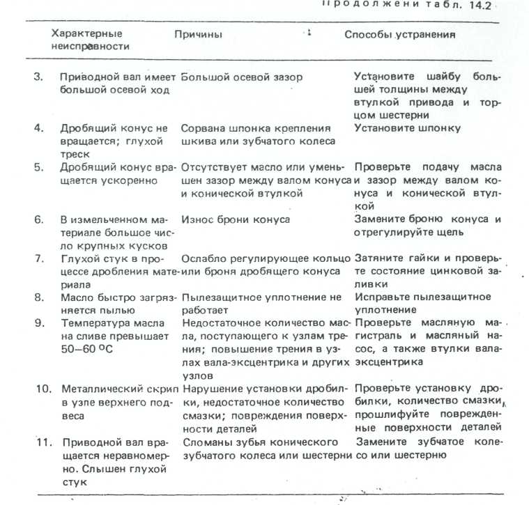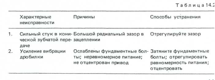 4.5. Перечень характерных неисправностей дробилки и способы их устранения приведены в табл. 14.2.