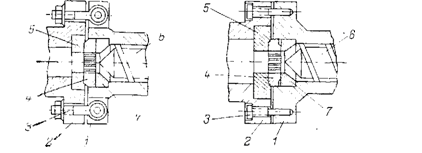 Корпус экструдера может соединяться с головкой при помощи одного из следующих четырех типов соединений: 1) фланцевое крепление обычными болтами (рис.4); 2) фланцевое крепление откидными шарнирными болтами (рис.5); 3) быстродействующий затвор, состоящий из двух стяжных клиновых хомутов (рис. 5); 4) быстродействующий байонетный затвор, состоящий из установленной на корпусе байонетной гайки и неподвижного упорного фланца.