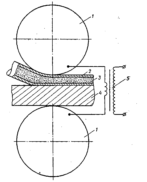 Рис. 12. Схема процесса электроконтактной наплавки порошкового материала, заключенного в металлическую оболочку: 1 – электроды электроконтактной установки; 2 – металлическая оболочка; 3 – порошковый материал; 4 – наплавляемая заготовка; 5 – источник питания