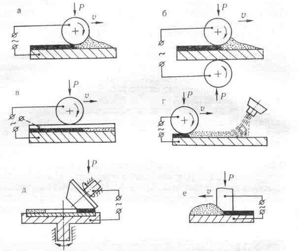 Рис. 10. Технологические схемы нанесения покрытий на плоские поверхности: а – с одним роликом; б – с двумя роликами; в – с использованием фольги или «нейтрального» ролика; г – с предварительным напылением; д. – с коническим роликом; е – с электродом–пуансоном.
