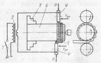 1 – прерыватель тока; 2 – трансформатор; 3 – кулачки патрона базового станка; 4 и 4' – наплавляющие ролики; 5 – наплавленный металл; 6–металл основы.