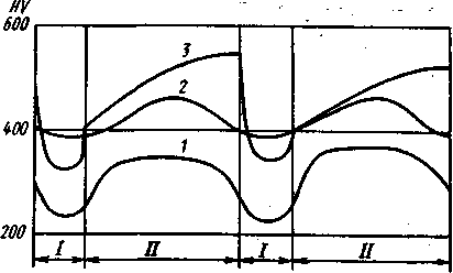 Упрочнение происходит неравномерно (рис. 1). Наиболее интенсивно упрочнение происходит в зонах наплавленного слоя, не подвергающихся термическому воздействию последующих импульсов тока (см. рис. 1, зона II). Площадь этих зон составляет 50–90% от общей площади наплавленной поверхности. Остальная часть наплавленного слоя разупрочняется при наварке смежных участков в результате повторного термического воздействия. Степень разупрочнения повышается при увеличении содержания углерода в стали и снижении содержания легирующих элементов.
