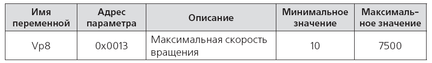 27. Настройте параметр vp8 (Максимальная скорость вращения) в соответствие с максимальной рабочей нагрузкой на валу двигателя таким образом, чтобы скорость вращения вала достигала заданного значения в статическом режиме.