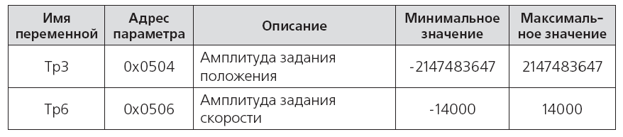 Описание: если параметр Tp1=Ступенька/ Приращение скорости, то Tp6 определяет приращение, которое будет добавлено к текущей позиции/скорости в момент проведения теста. Если параметр Tp1=Синус/ Синусоидальное изменение скорости, то Tp6 определяет амплитуду синусоидального задания контура позиции/скорости.
