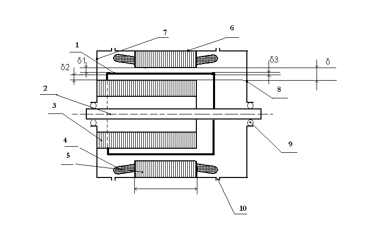 Неподвижная часть машины состоит из внешнего магнитопровода 5 с обмотками 4,внутреннего магнитопровода 3, корпуса 6, левого 7 и правого 8 подшипниковых щитов с подшипниками 9 и узлов 10 соединения корпуса со щитами. Подвижная часть машины содержит вал 2 с жёстко укреплённым на нём тонкостенным цилиндром 1. Внешний магнитопровод 5 неявнополюсный, представляет собой стальное кольцо собранное из листовой электротехнической стали, по внутренней поверхности которого расположены пазы, в которые укладываются две распределённые обмотки, изготовленные из изолированного медного провода круглого или прямоугольного сечения. Оси этих обмоток смещены в пространстве на 90 электрических градусов. Внутренний магнитопровод 3 также неявнополюсный,набран из листов электоротехнической стали и укреплён на цилиндрическом выступе одного из подшипниковых щитов 7. Он служит для уменьшения магнитного сопротивления на пути рабочего магнитного потока машины и не имеет пазов и обмоток.