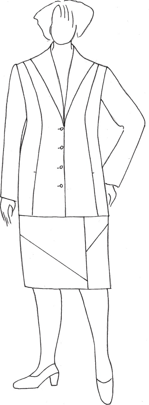 В данном комплекте в целом форма и цветовое решение выбраны верно. Комплект симметричен и статичен. В комплекте преобладают вертикальные членения в местах рельефа и борта. Вертикальные членения несут конструктивную нагрузку. С помощью вертикальных линий модель зрительно вытягивается. Неудачно выбрана пропорция в костюме. Минусом в данной модели является длина юбки, доходящая до середины колена. Такая длина нежелательная для фигуры 3-го типа телосложения. Данная длина зрительно расширяет фигуру. Композиционным центром в данной модели являются пуговицы, несущие декоративную нагрузку. В целом комплект не достиг завершенности композиции.