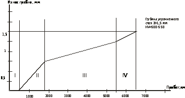 Из рис. 4(б) видно, что износ упрочненных гребней несколько отличается и выделяются некоторые этапы в механизме изнашивания. Это отчетливо видно, если рассмотреть кривую изнашивания упрочненного слоя (рис.5), где показаны эти этапы.
