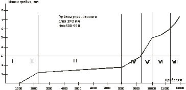 Четвертый этап заключается в увеличении интенсивности изнашивания упрочненного слоя – катастрофический износ. После полного изнашивания упрочненного слоя износ гребней возрастает (рис.6), т.к. происходит резкое изменение физико–механических свойств металла (структура, шероховатость, твердость, коэффициент трения и т.д.).