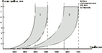 Рис. 6 Кривая изнашивания упрочненного слоя на гребнях колесных пар ВЛ 10 с диапазоном толщин бандажа 80-94 мм (выборка 110 к.п.)