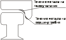 Качение колеса по рельсу с проскальзыванием (от 0 до 100 %) вызывает в основном два процесса разрушения: объемную пластическую деформацию (снятие) и абразивный износ. Объемная пластическая деформация неравномерна по глубине от поверхности катания, достигает наибольших величин непосредственно у поверхности и уменьшается по мере удаления от нее. Согласно 5, давление в контакте «колесо-рельс» в реальных условиях эксплуатации изменяется от 1,7 ( - предел текучести колесной и рельсовой стали) до 3 и более. Результатом пластической деформации является течение металла из зоны основания гребня на поверхность катания и на вершину гребня, рис. 1.