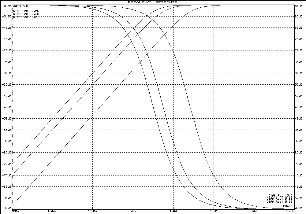 Для исследования частотных характеристик реального дифференцирующего звена в прикладном пакете Proteus\ISIS составляем структурную схему, представленную на рисунке 43. Логарифмические частотные характеристики реального дифференцирующего звена представлены на рисунке 44, переходные функции – на рисунке 45.
