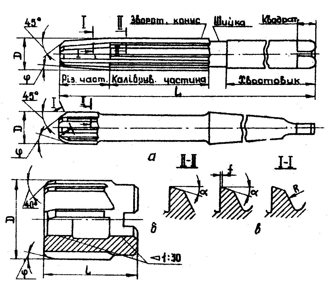 4.1Ручні розвертки застосовують для розверчування отворів вручну. Розвертки діаметром 3…40 мм мають циліндричний хвостовик з квадратом для воротка. Розвертки відносно малого діаметра виготовляють з циліндричним або конічним хвостовиком, за допомогою яких їх закріплюють на верстаті.