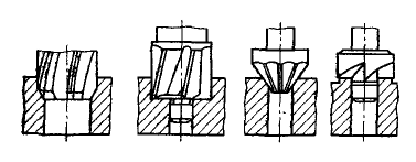 На мал. 3.3,б показаний насадний зенкер збірної конструкції. Такі зенкери роблять діаметром 40-120 мм. Зуби кріпляться за допомогою рифлень (мал. 3.3, а), клину (мал. 3.3,6) або без клину (мал. 3.3, в). Вони допускають регулювання діаметру. Зуби можуть бути з швидкорізальної сталі або із сталі 45 з твердосплавними пластинками, що напаяли. Передня поверхня плоска; зуби мають нахил уздовж осі під кутом φ = 10.