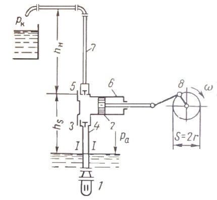 При повороте кривошипа 8 по стрелке со от 0° до 180° поршень 2 перемещается в сторону увеличения объема цилиндра и образует разреженное пространство. Всасывающий клапан 3 открывается и жидкость по всасывающей трубе 4, под действием атмосферного давления, устремляется из бассейна в цилиндр насоса. При обратном ходе поршня из правого крайнего положения влево, что соответствует повороту кривошипа от 180° до 360°, всасывающий клапан закрывается, а нагнетательный клапан 5 открывается и жидкость выталкивается в нагнетательный трубопровод 7.