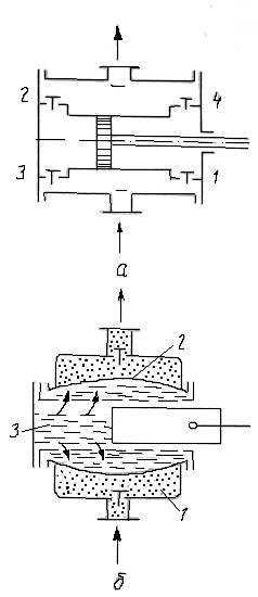 В насосах двойного действия обе стороны поршня являются рабочими. Цилиндры таких насосов имеют четыре клапана (см. рис. 1.3, а). При ходе поршня влево всасывающий 1 и нагнетательный 2 клапаны открыты. Через клапан 1 происходит всасывание, а через клапан 2 — вытеснение жидкости в нагнетательный трубопровод. В это время клапаны 3 и 4 закрыты. При обратном ходе поршня через клапан 3 жидкость поступает в цилиндр, а через клапан 4 производится подача жидкости в нагнетательный трубопровод. В рассматриваемых насосах всасывание и нагнетание жидкости происходит при каждом ходе поршня.