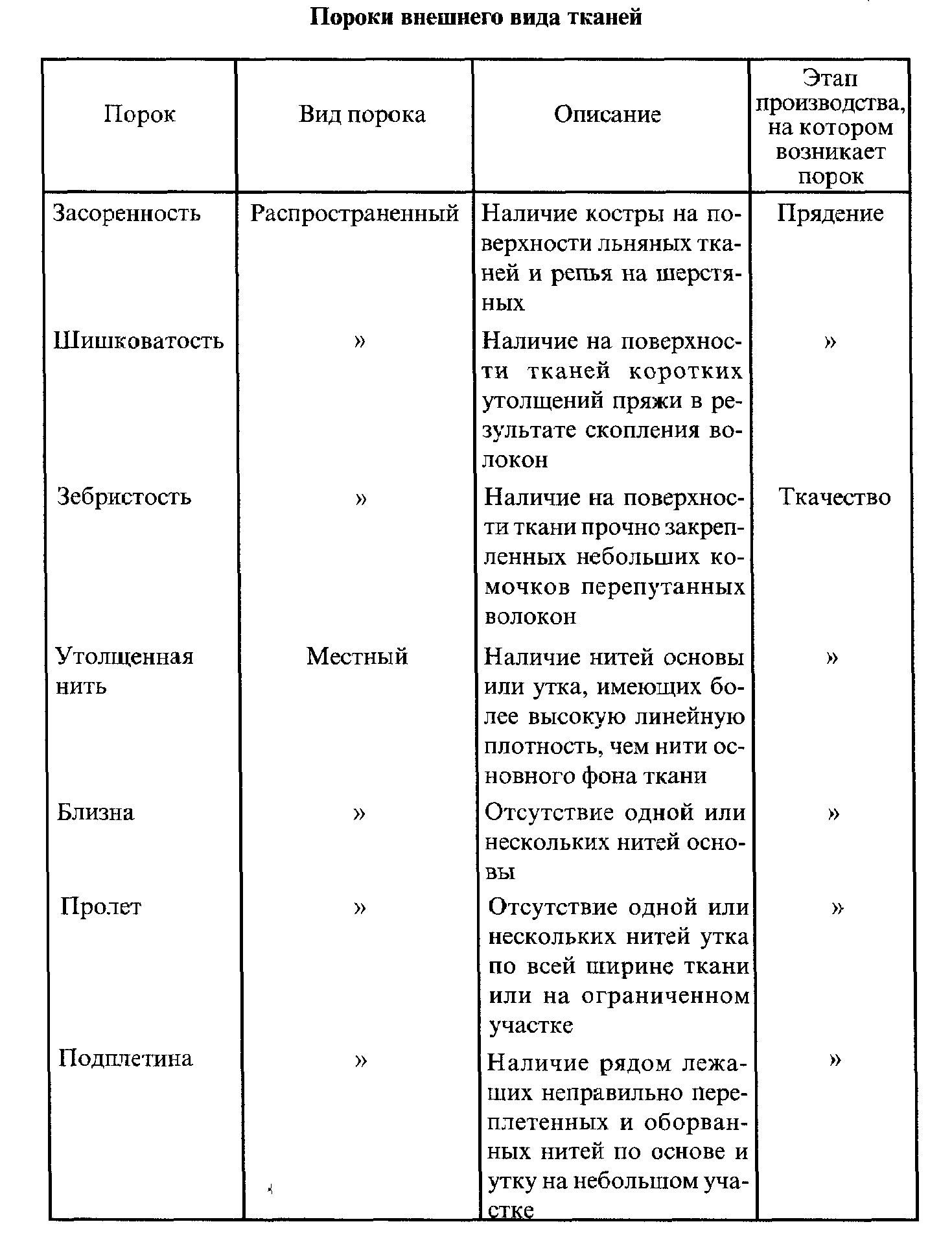 Различают пороки местные, которые имеют небольшие размеры и расположены на ограниченных участках ткани, и распространенные по всему куску или по его значительной части. Наиболее часто встречающиеся пороки внешнего вида тканей приведены в табл. 1.