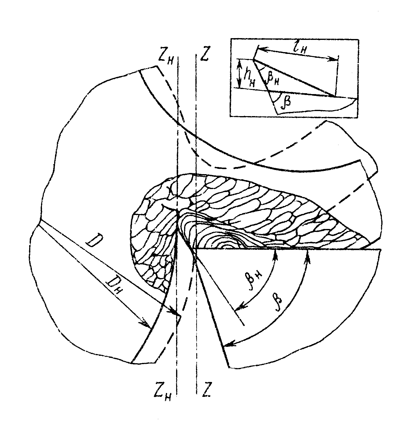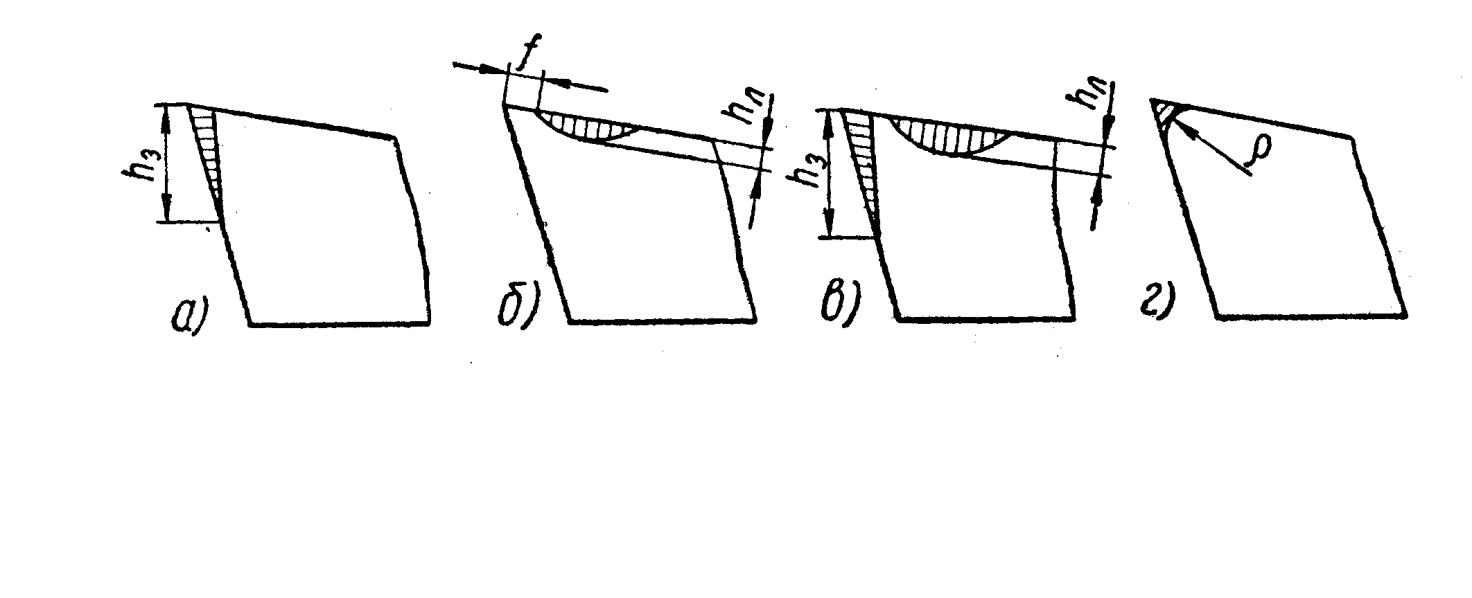 Залежно від умов процесу різання спрацювання інструменту може проходити по різному: 1. Спрацювання переважно по задній поверхні має місце при обробці пластичних матеріалів з товщиною зрізу меншою 0,1 мм крихких матеріалів з утворенням стружки надлому (рис.14а). При цьому на задній грані інструменту утворюється площадка висотою hз з α=0о. 2. Спрацювання переважно по передній поверхні, коли обробляються пластичні матеріали з товщиною зрізу більшою 0,5 мм. Цей вид спрацювання характеризується глибиною лунки hл і її шириною в при ширині перемички f і довжині лунки l. Повне спрацювання настає тоді, коли f=0. 3. Спрацювання одночасно по передній і задній грані, коли оброблюється пластичний матеріал з товщиною зрізу 0,1-0,5 мм. Дереворізальні інструменти в процесі спрацювання збільшують свій радіус заокруглення ρ. Вгострому добр доведеному інструменті він може бути 0,005 мм. і в процесі роботи постійно збільшується. Різні види спрацювання інструменту показано на рис14.