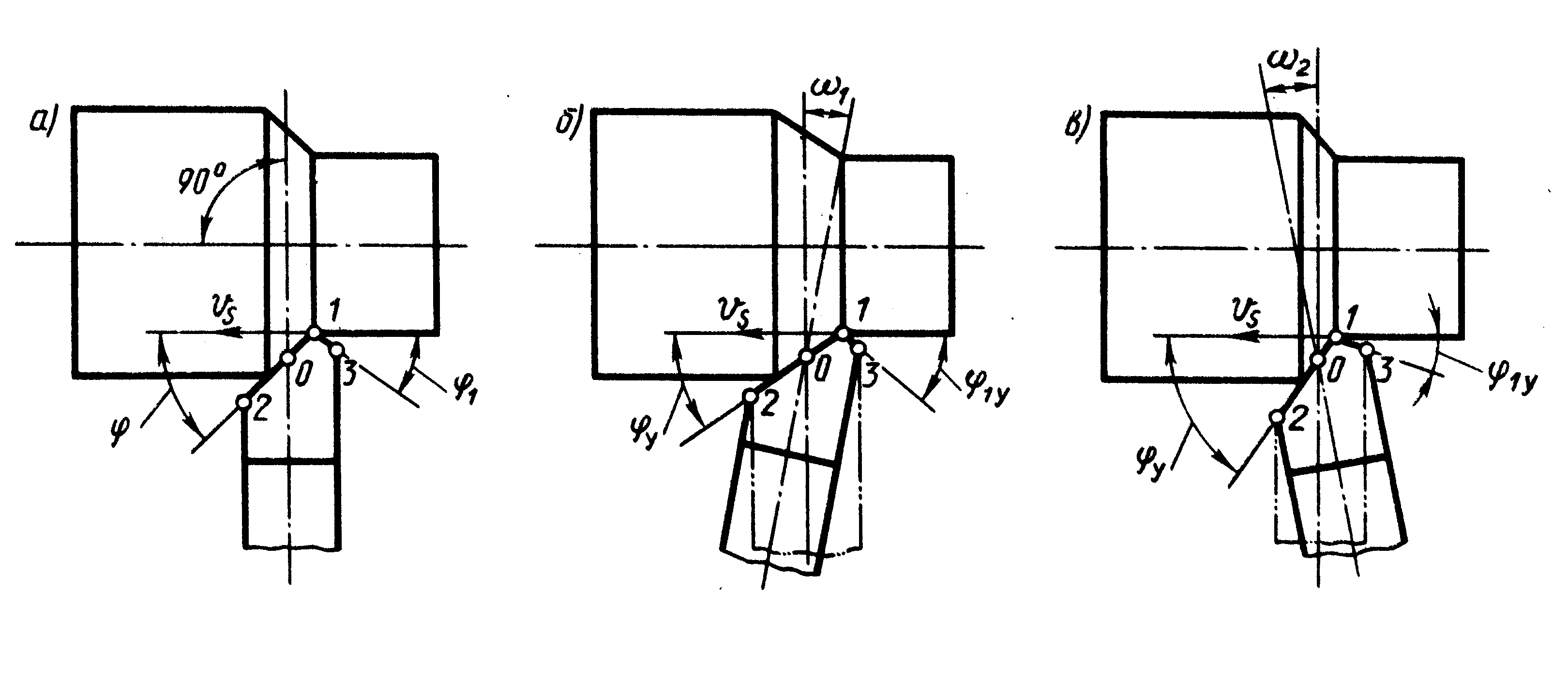 Всі розміри кутових параметрів різця будуть зберігатись в процесі різання лише в тому випадку, коли вершина різця встановлена на висоті обертання заготовки, геометрична вісь різця строго перпендикулярна до вісі обертання заготовки і вектор швидкості подачі направлений вздовж вісі обертання заготовки (перпендикулярно до вісі різця). Любі відхилення від цих положень (випадкові чи спеціальні) ведуть до зміни значень одного або декількох кутових геометричних параметрів. На рис.5 показано вплив повертання різця навколо вертикальної вісі на деякий кут . При цьому міняються значення кутів і 1. Всі інші кутові параметри не міняються.