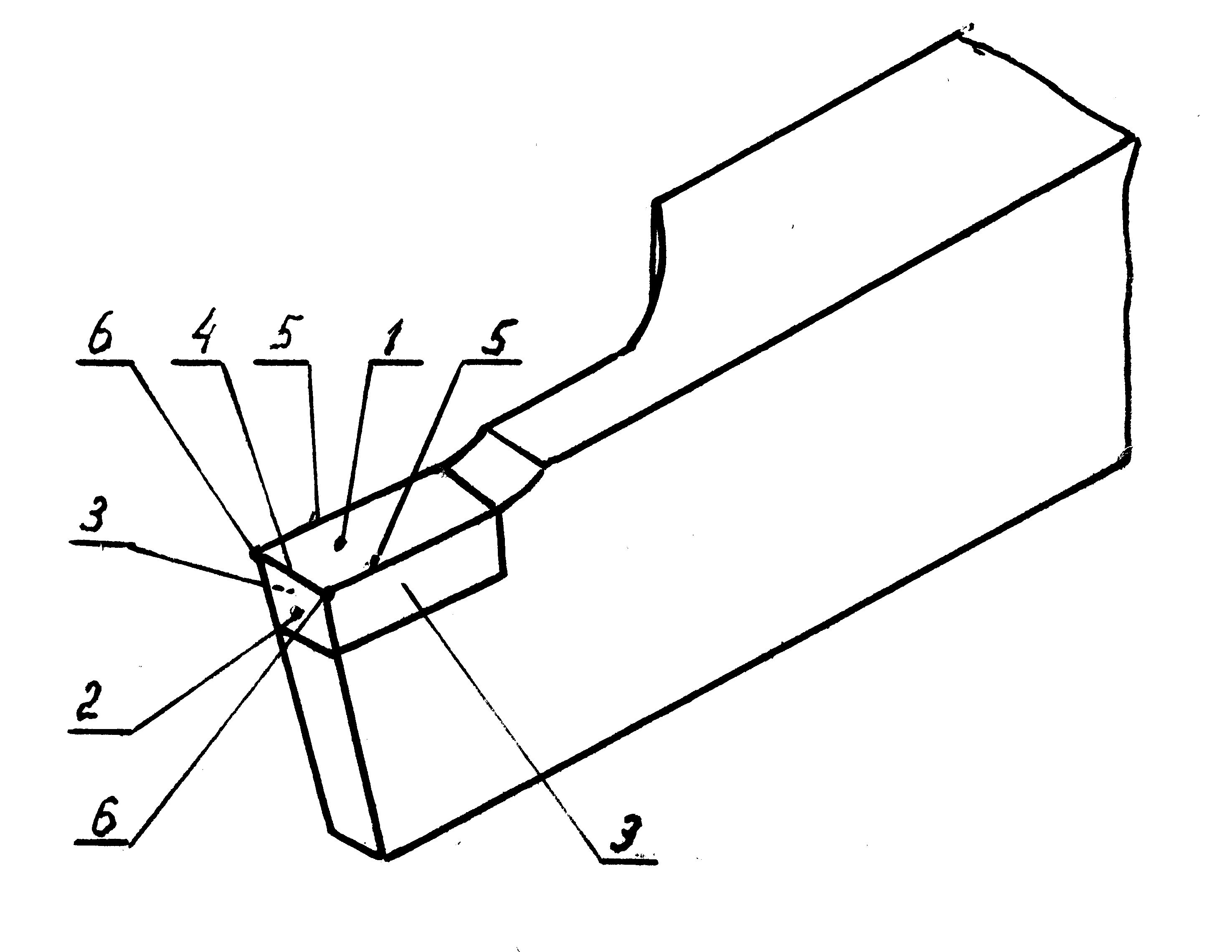 Відрізний різець (рис.3) має одну передню поверхню (1), головну задню поверхню (2), дві допоміжні задні поверхні (3), головну різальну кромку (4), дві допоміжні різальні кромки (5) і дві вершини (6).