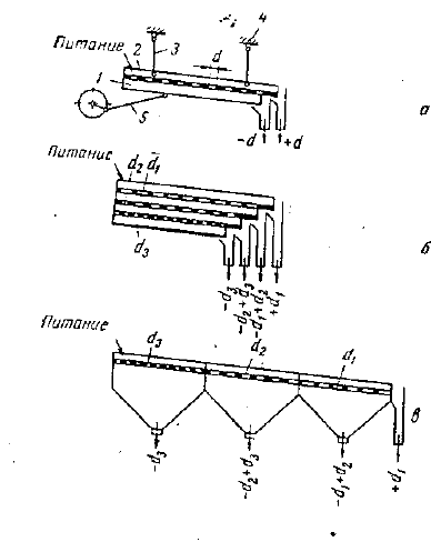 Для разделения материала на несколько фракции изготовляют многоситовые грохоты. При этом сита компонуются либо по высоте (рис 1, б), либо по длине (рис 1, в). В обоих случаях эффективность классификации и производительность грохота примерно одинакова, на вертикальная компоновка сит занимает меньше места в плане, на больше по высоте, а при горизонтальной наоборот.