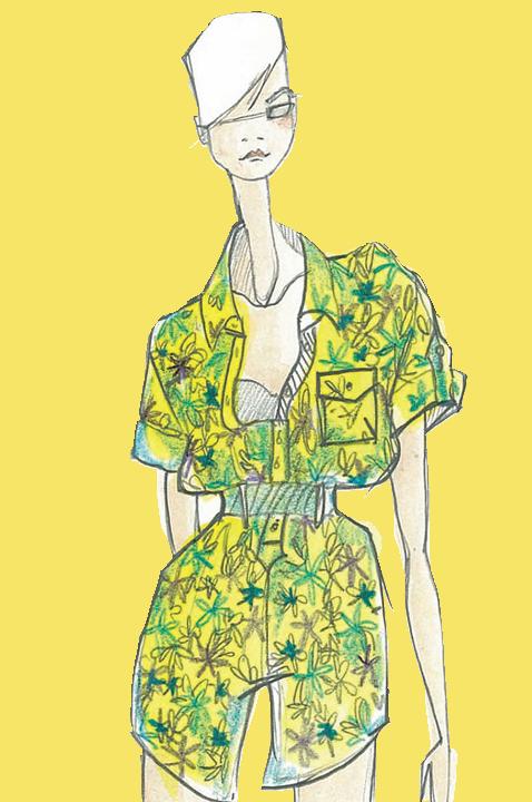 Силуэт вдохновляет ретро-испанская элегантность, упорядоченный черным цветом жакет и цветная рубашка. Учащийся частной средней школы, в виде "плохого" мальчика - полного фантазии. Жакет из нейлона стиля "Курорт" более спортивный и более современный вид пользовавшийся популярностью в былые времена туфли лодочки.