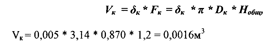 V= 0,008 * [3,14 * (0,594 + 0,043) * (0,853 + 0,008)] = 0,0138 м3.