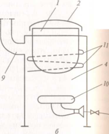 Рисунок 2. Принципиальные схемы котлов с косвенным обогревом стенки варочного сосуда: А— стационарных; Б— опрокидывающихся; 1 — варочный сосуд; 2 — паро водяная рубашка; 3 — откидные прижимные болты; 4 — клапан «турбинка».5 крышка; 6 — двойной предохранительный клапан; 7— манометр; 8 — заливочная воронка; 9 — штурвал поворотного червячного редуктора; 10 — станина; парогенератор; 12 — тепловая изоляция; 13— кран слива жидкости; 14— защитная сетка; 15 — кран для залива жидкости и выпуска воздуха
