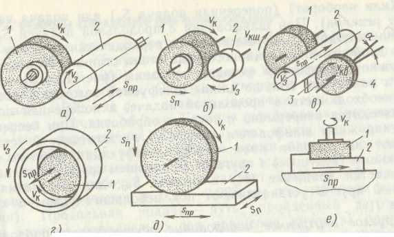 В зависимости от расположения и формы обрабатываемой поверхности заготовки 2 шлифование подразделяют на: наружное (рис.3,а,б,в), когда обрабатывается наружная поверхность заготовки; внутреннее (рис.3,г), когда обрабатывается внутренняя поверхность; плоское (рис.3,д,е), когда обрабатывается плоская поверхность;