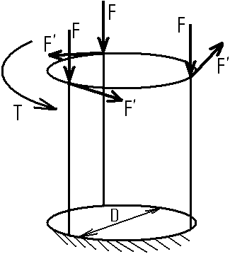 Каждая ножна нагружена изгибающим M и крутящим T моментами, сжимающей F и срезающей F’ силами (см. рис.).