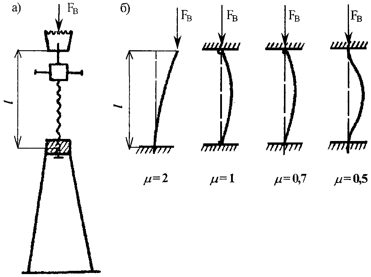 l - свободная длина винта - расстояние между опорой винта и серединой гайки: l = hНОЖ (l - приведенная длина винта); - коэффициент приведения длины зависит от способа закрепления концов винта (см. рис.); i - осевой радиус инерции сечения винта: