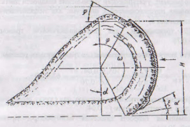 В поперечном сечении профиль отвала обычно очерчивается по дуге окружности (рис.1). При таком профиле стружка вырезаемого грунта, перемещаясь по отвалу вверх, поворачивается на нём в направлении его движения и, дойдя до верхней кромки отвала, рассыпается или опрокидывается перед ним, образуя призму грунта.