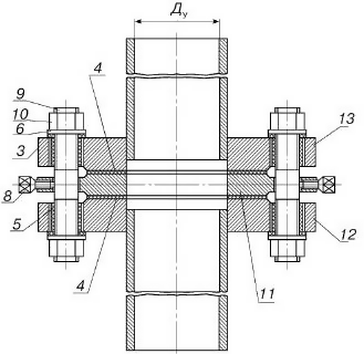 Изолирующее фланцевое соединение: 3, 4 — прокладки; 5 — втулка; 6 — шайба; 8 — винт; 9 — шпилька; 10 — гайка; 11, 12, 13 — фланец.