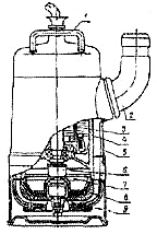 В верхней части крышки насоса имеется отверстие с резьбой, куда подсоединен вентиль для удаления воздуха из насоса. Рабочее колесо установлено в середине горизонтального вала, на концы которого насажены подшипники качения. Подшипники установлены в корпусные гнезда. Вал уплотняется сальниковыми уплотнениями, установленные в сальниковые коробки. Сальники состоят из двух симметричных половинок сальникового фланца, промасленной набивки и сальникового кольца. Поверхности соприкасания корпуса и крышки уплотняются бумажной прокладкой. Направление вращения рабочего колеса обратно движению часовой стрелки, если смотреть со стороны электродвигателя. При работе насоса должен быть постоянный проток воды через сальники в виде капель или тонкой струйки.