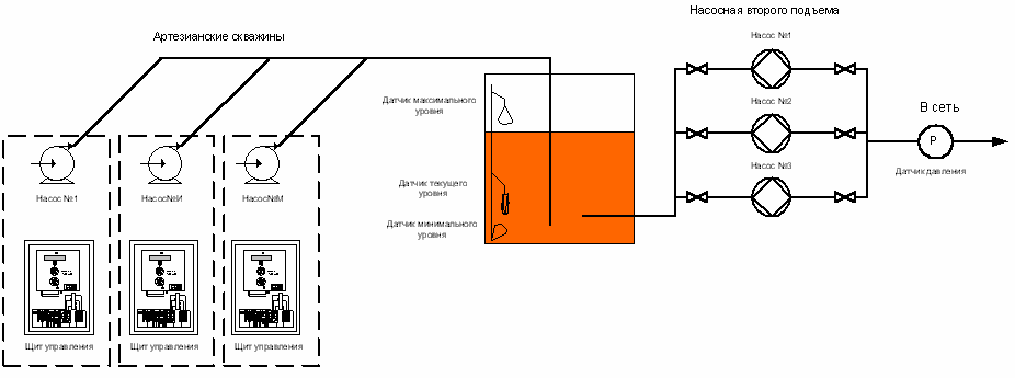 Регулирование давления воды в коллекторе в автоматическом режиме осуществляется одним из основных насосов. В зависимости от изменения сигнала с аналогового датчика, ЧРП меняет частоту вращения электродвигателя насоса. После раскрутки основного насоса до максимальных оборотов и при дальнейшем снижении давления, система через мягкий пускатель обеспечивает плавный, при минимальных пусковых токах и гидродинамических нагрузках, пуск дополнительного насоса. При этом, после включения дополнительного насоса, точная регулировка давления осуществляется основным насосом. При увеличении давления вследствии уменьшения разбора воды система производит отключение дополнительного насоса и понижает частоту вращения двигателя основного насоса до минимальных оборотов. Уставка давления в коллекторе изменяется автоматически в зависимости от времени суток. Определено три вида уставок: ночная, дневная, вечерняя. Кроме того, система поддерживает разные уставки давления в выходные и рабочие дни и осуществляет плавный переход с одной уставки на другую.