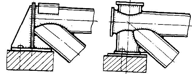 Трубы, применяемые для изготовления ферм, стоек, колонн, опор и других строений, свариваются с различными углами (рис.154). В этих случаях наиболее сложна и ответственна подготовка кромок под сборку и сварку. Сборочные прихватки делают в удобных местах сопряжения. Швы по контуру сопряжения соединяемых трубчатых элементов лучше выполнять по принципу обратноступенчатой сварки.