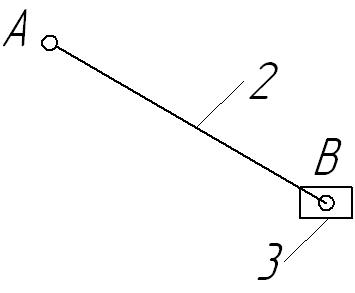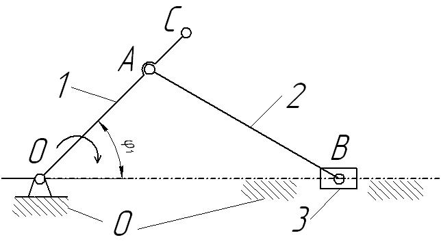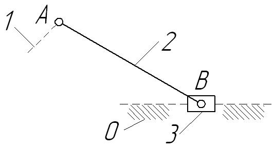 при этом звенья 1 – 3 являются подвижными звеньями, а стойка 0 – неподвижным звеном. Она представлена в составе структурной схемы двумя шарнирно-неподвижными опорами и направляющей ползуна 3.