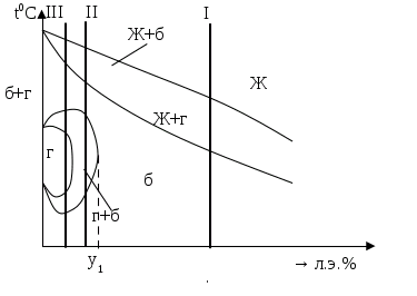 При содержании легирующего элемента (л.э.) > y>1> %, сплавы (типа I) при всех температурах состоят из твердого раствора л.э. в б-железе. Такие сплавы называются – ферритными (например, образуются при содержании Cr>12%).