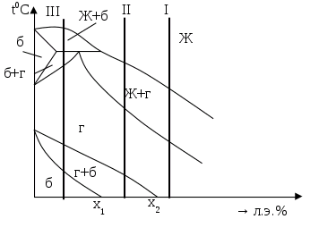 І сплав – г- фаза закристаллизовалась и существует до комнатной температуры, т.е. сплав с концентрацией л.э. > x>2> не испытывает фазовых превращений (б ↔ г). Такие сплавы называют аустенитными.
