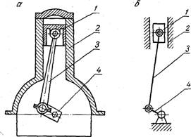 Па рис. 1.1, а в качестве примера представлена конструктивная схема механизма двигателя внутреннего сгорания, а на рис. 1.1, б — его кинематическая схема. Механизм имеет четыре звена: поршень У, неподвижный цилиндр 2, шатун 3 и кривошип 4, образующих кинематическую цепь, состоящую из одной поступательной пары: стойка (неподвижный цилиндр) — ползун, и трех вращательах пар — ползун — шатун, шатун — кривошип, кршюшип — гойка.