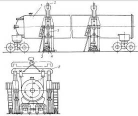 Барабанные вращающиеся печи, применяемые в химической промышленности для обжига твердых веществ, представляют собой стальной цилиндрический кожух, длиной до 180 м., футерованный изнутри огнеупорными материалами. Вес печи достигает сотен тонн. На кожух печи надето два или несколько бандажей, посредством которых он опирается на ролики. Печь приводится во вращение от электродвигателя через привод, подвенцовую и венцовую шестерни. Печь устанавливается под углом 2-3 к горизонту. Основными требованиями, предъявляемыми к смонтированной барабанной печи, являются: прямолинейность продольной оси печи, лёгкость её вращения, наличие проектных зазоров для компенсации теплового расширения между бандажами и корпусом печи, отсутствие биения корпуса печи и зубчатого венца при вращении печи, отсутствие тенденции к смещению печи вдоль продольной оси при её вращении, надёжное уплотнение в листах примыкания концов барабана печи к неподвижным частям (особенно в тех случаях, когда при работе печи выделяются вредные газы)