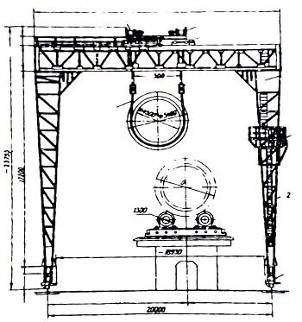 Сварка наружных швов производится с металлического мостика шириной 2 м, длиной 5 м. Мостик перемещается и поддерживается козловым краном КМК-120.